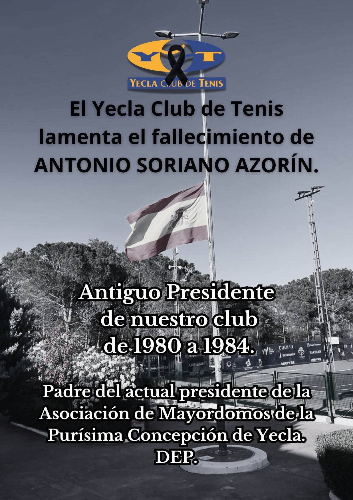 El Yecla Club de Tenis lamenta informar del fallecimiento del que fuera nuestro presidente (1980 - 1984), D. Antonio Soriano Azorín.